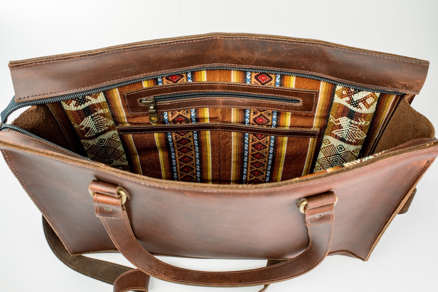 Features: Bolivian design polyester lining, cushioned laptop pocket ideal for 15" laptop, 2 open interior pockets, interior zippered pocket.
