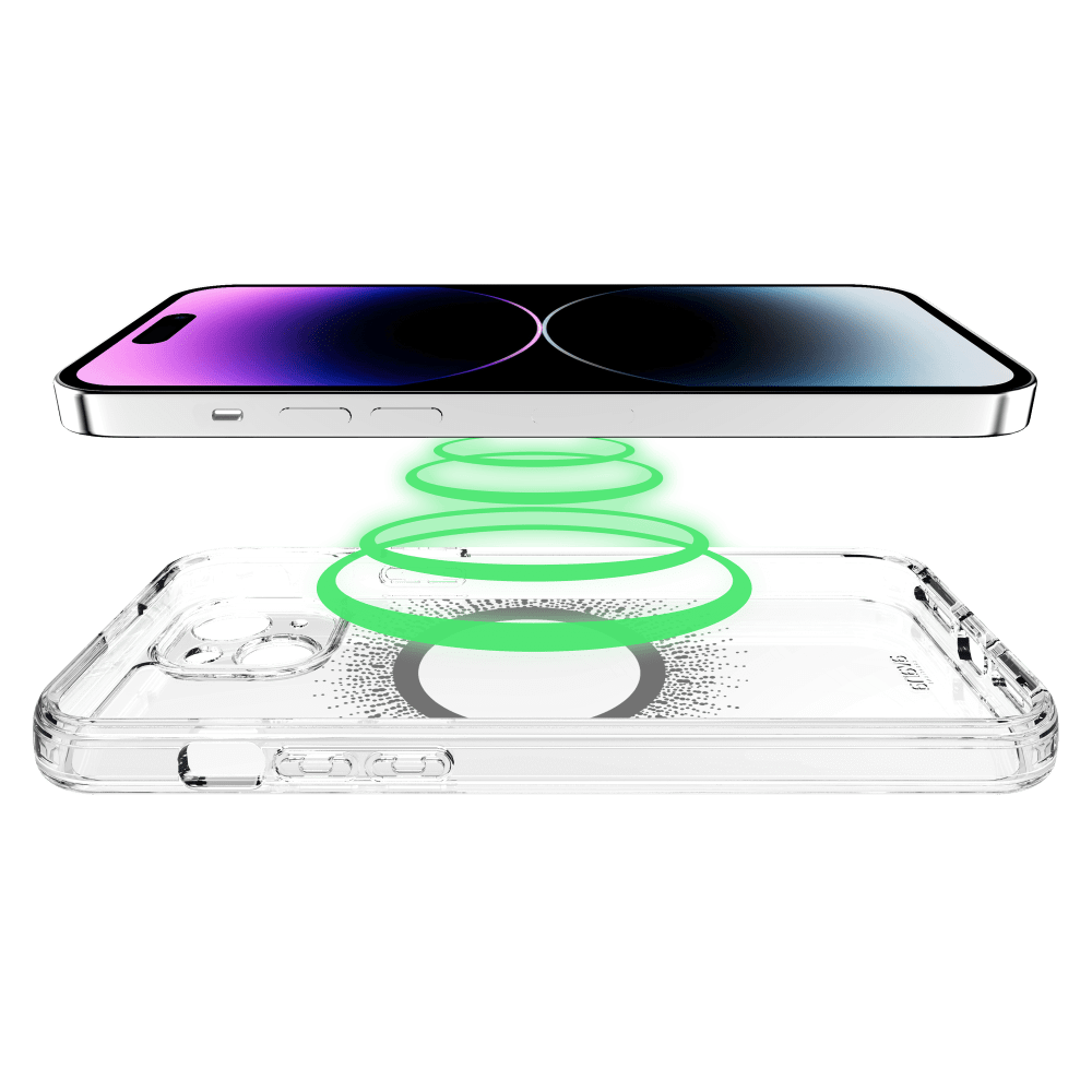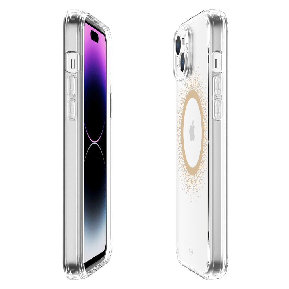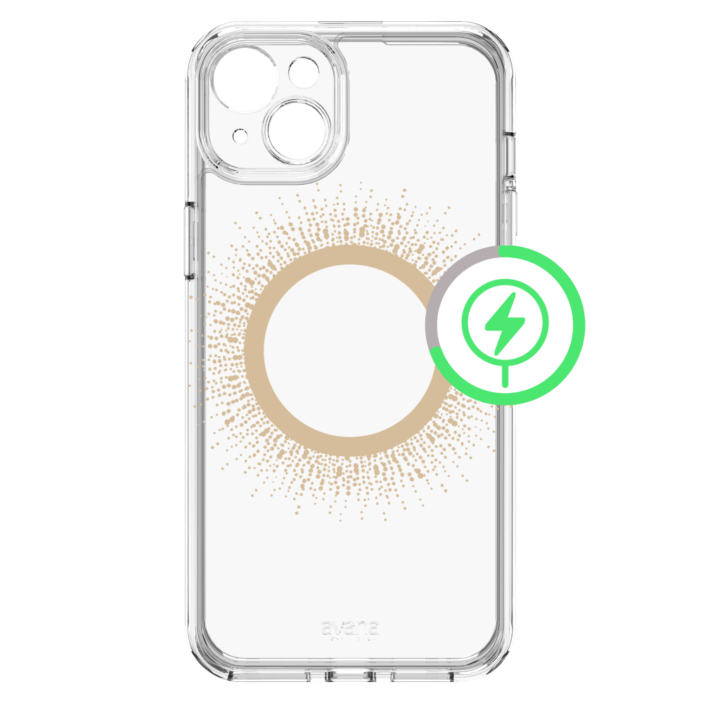 Love MagSafe but hate the ring? We've got you covered! We added beautiful metallic foil designs to this clear case that shine and conceal the magnet ring with the avana creations aura Clear Magnetic Phone case! Our case combines style and protection effortlessly. It's super flexible and lightweight, so you won't even notice it in your pocket. It can handle drops, scratches, and cracks like a champ. Plus, the raised edges make sure your screen and camera stay safe from any potential damage. This clear phone case has a built-in magnetic ring that works smoothly with magnetic leather wallets, Qi-certified wireless chargers, magnetic car holders, magnetic battery banks, and more. No more fumbling around just snap it on and you're good to go. We've packed in serious shock absorption technology and reinforced corners to keep your phone safe from accidental drops and impacts. Plus, our ultra-responsive buttons ensure you won't lose that tactile feel, making navigation a breeze. Sustainably-made, ultra-protective, and stylish cases designed for lifestyle-conscious customers. Enjoy military drop protection up to 10 feet, self-healing, and anti-scratch features. Show off your phone's sleek design while keeping it safe with avana creations. It's fashion, style, and functionality all rolled into one!
