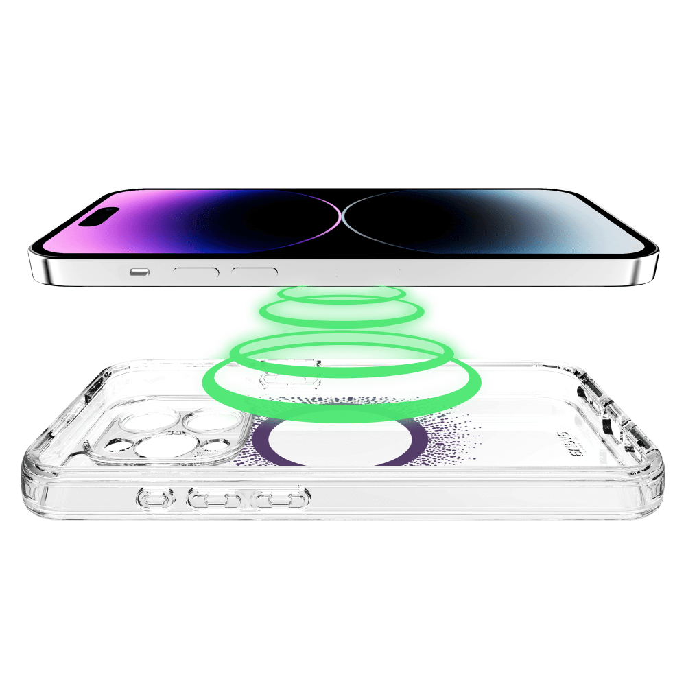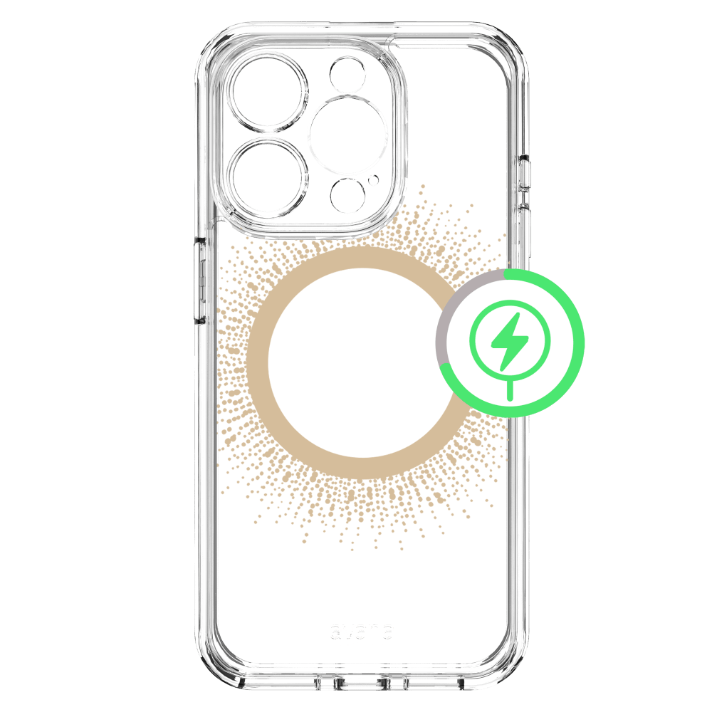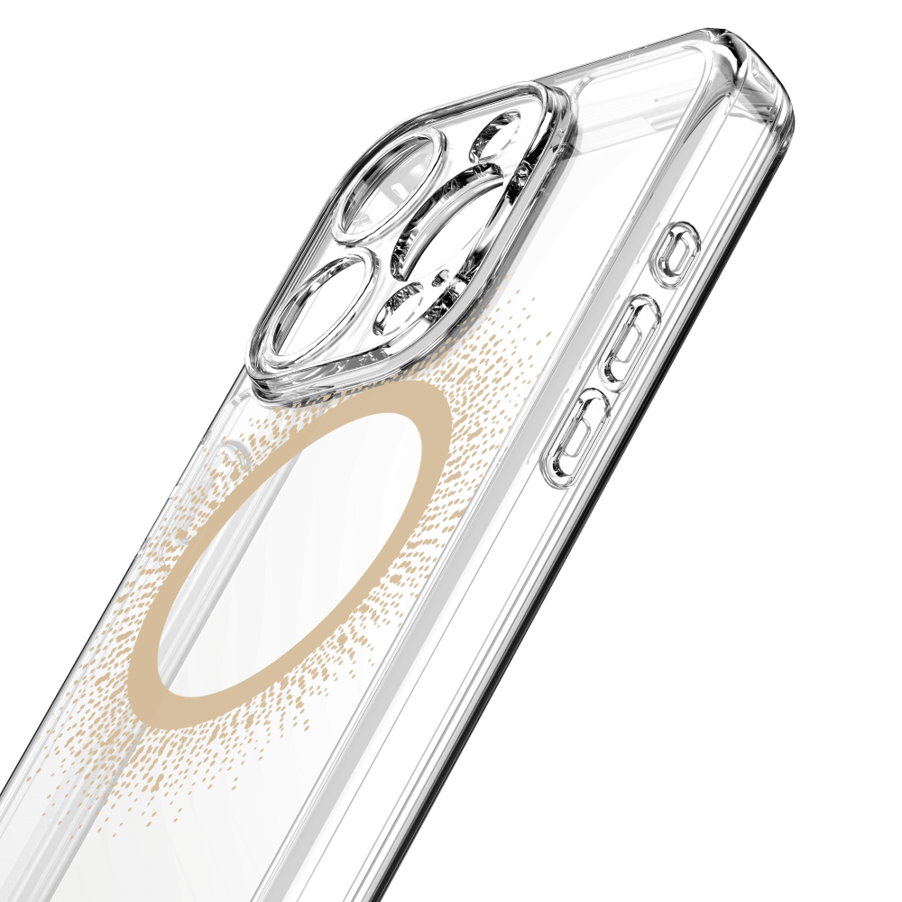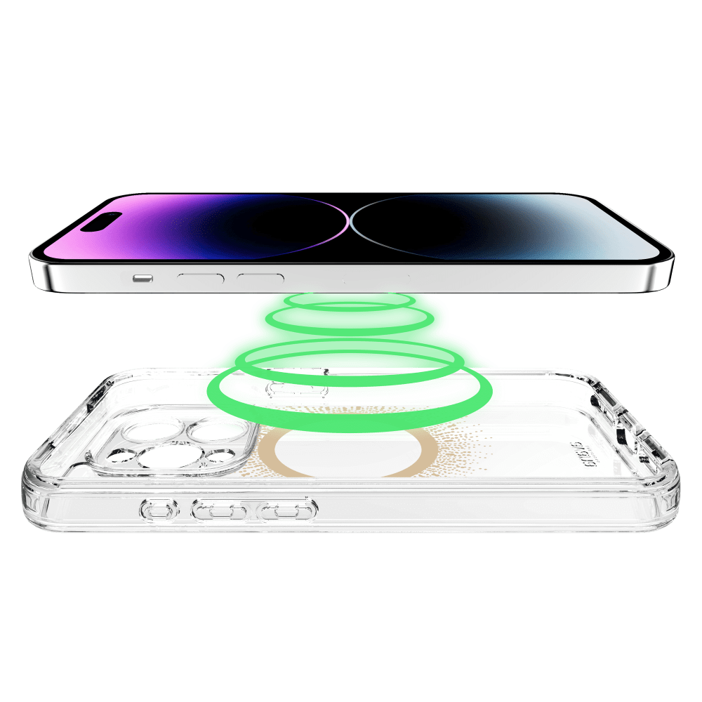 Love MagSafe but hate the ring? We've got you covered! We added beautiful metallic foil designs to this clear case that shine and conceal the magnet ring with the avana creations aura Clear Magnetic Phone case! Our case combines style and protection effortlessly. It's super flexible and lightweight, so you won't even notice it in your pocket. It can handle drops, scratches, and cracks like a champ. Plus, the raised edges make sure your screen and camera stay safe from any potential damage. This clear phone case has a built-in magnetic ring that works smoothly with magnetic leather wallets, Qi-certified wireless chargers, magnetic car holders, magnetic battery banks, and more. No more fumbling around just snap it on and you're good to go. We've packed in serious shock absorption technology and reinforced corners to keep your phone safe from accidental drops and impacts. Plus, our ultra-responsive buttons ensure you won't lose that tactile feel, making navigation a breeze. Sustainably-made, ultra-protective, and stylish cases designed for lifestyle-conscious customers. Enjoy military drop protection up to 10 feet, self-healing, and anti-scratch features. Show off your phone's sleek design while keeping it safe with avana creations. It's fashion, style, and functionality all rolled into one!