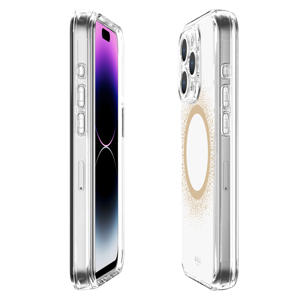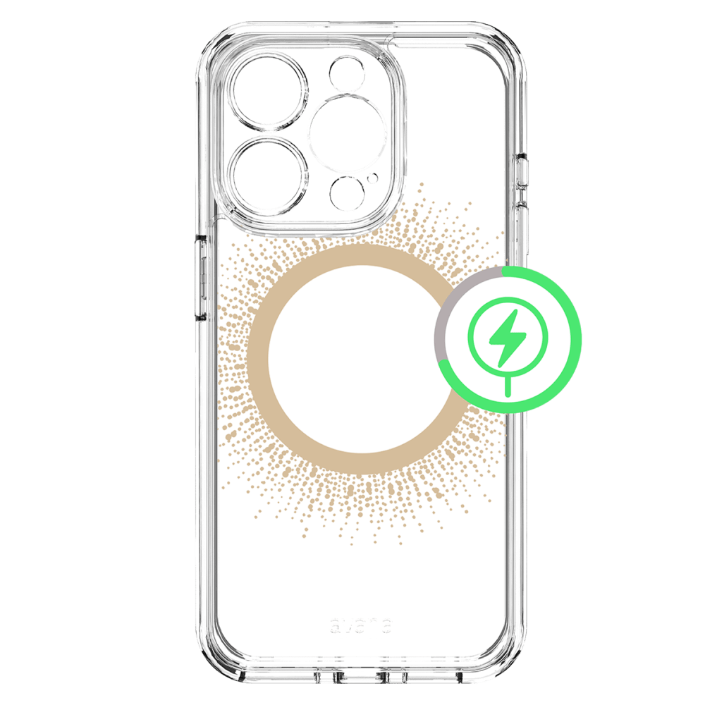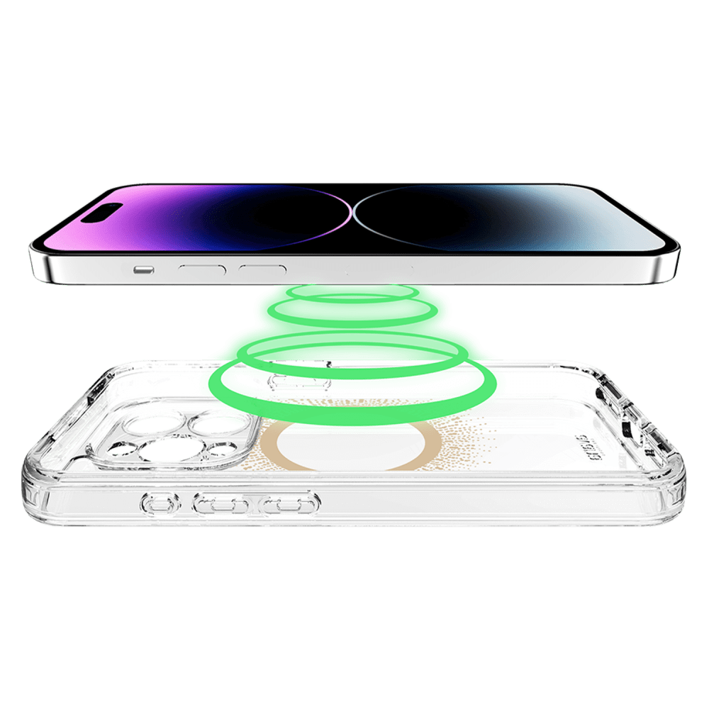 Love MagSafe but hate the ring? We've got you covered! We added beautiful metallic foil designs to this clear case that shine and conceal the magnet ring with the avana creations aura Clear Magnetic Phone case! Our case combines style and protection effortlessly. It's super flexible and lightweight, so you won't even notice it in your pocket. It can handle drops, scratches, and cracks like a champ. Plus, the raised edges make sure your screen and camera stay safe from any potential damage. This clear phone case has a built-in magnetic ring that works smoothly with magnetic leather wallets, Qi-certified wireless chargers, magnetic car holders, magnetic battery banks, and more. No more fumbling around just snap it on and you're good to go. We've packed in serious shock absorption technology and reinforced corners to keep your phone safe from accidental drops and impacts. Plus, our ultra-responsive buttons ensure you won't lose that tactile feel, making navigation a breeze. Sustainably-made, ultra-protective, and stylish cases designed for lifestyle-conscious customers. Enjoy military drop protection up to 10 feet, self-healing, and anti-scratch features. Show off your phone's sleek design while keeping it safe with avana creations. It's fashion, style, and functionality all rolled into one!