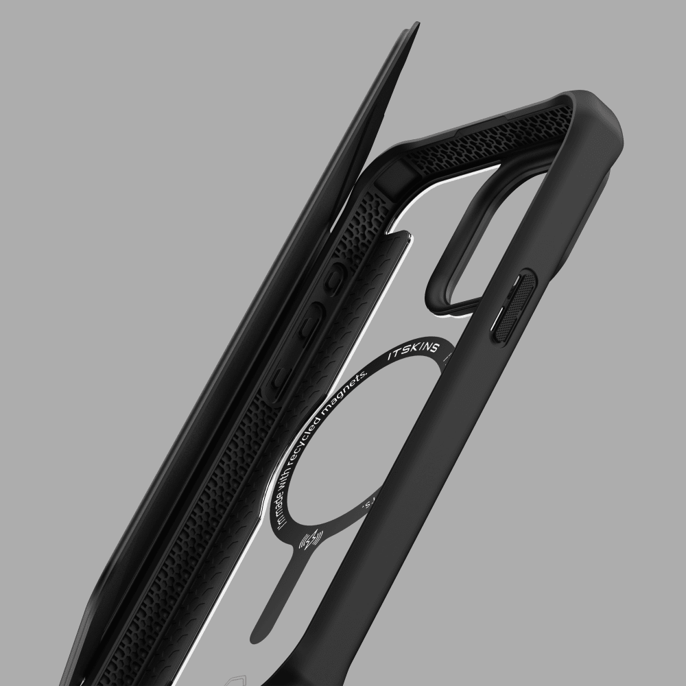 The best of both worlds. ITSKINS crossed an optical-grade acrylic armor hardback with a solid, reinforced bumper that offers extra perimeter protection while showing off the design of your phone. HYBRID_R offers premium drop protection to your device. ITSKINS signature HEXOTEK impact absorption technology has been integrated into the interior perimeter of the case, making it drop safe from up to 3M/ 10 Feet.